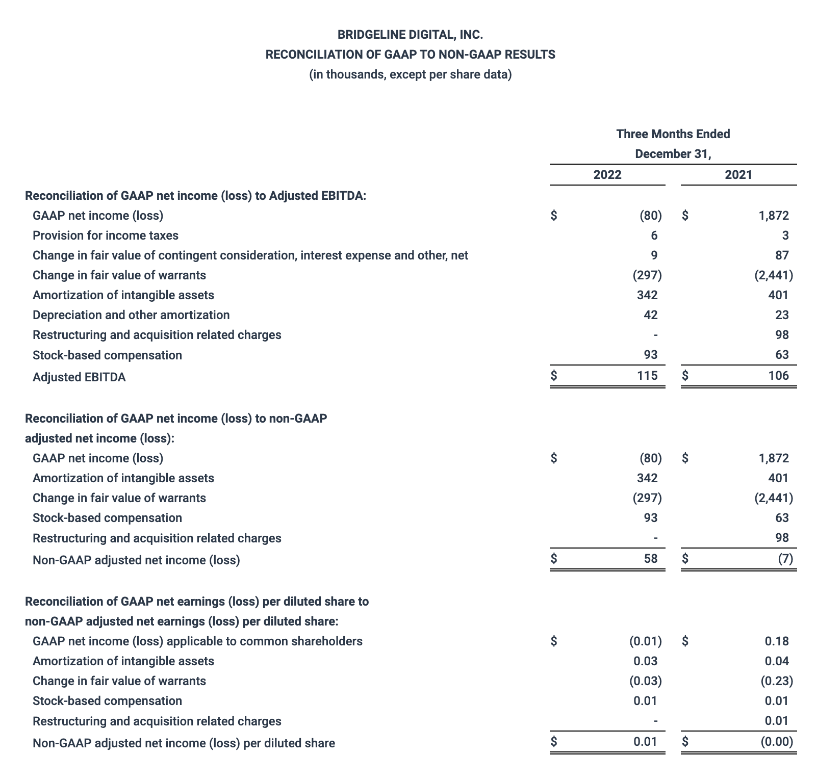 Adjusted EBITDA is defined as earnings before interest, taxes, depreciation and amortization, non-cash stock-based compensation charges, goodwill impairment charges, restructuring and acquisition-related costs, changes in fair value of warrants, amortization of debt discounts, preferred stock dividends and any related tax effects. Bridgeline uses non-GAAP adjusted net income/(loss) and Adjusted EBITDA as supplemental measures of our performance that are not required by, or presented in accordance with, accounting principles generally accepted in the United States ("GAAP").